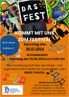 Kommt mit uns und dem Landkreis Neunkirchen, am 20.07.2024 mit nach Karlsruhe und gemeinsam besuchen wir „Das Fest“, eines der größten und beliebtesten Festival Deutschlands.