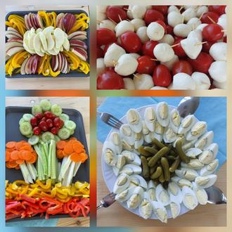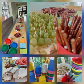 Viele fleißige Helfer*innen bauten das Buffet auf (räumten im Anschluss auch wieder auf und spülten), dekorierten, belegten Brote, richteten her, schnippelten Obst und Gemüse und legten damit liebevoll Figuren. Schmetterling, Sonne und Blume strahlten den Kindern vom Buffet entgegen, Müsli, Käse-Trauben-Spieße, saure Gurken, Eier, frische Wassermelone und Tomaten-Mozzarella-Spieße luden zum Zugreifen ein.