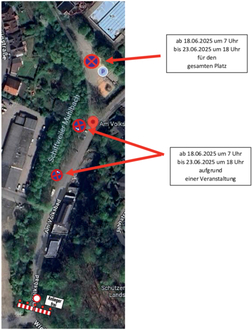 Darüber hinaus gilt ab Sonntag, dem 15. Juni 2025, ein absolutes Halteverbot im vorderen Bereich der Parkflächen oberhalb und unterhalb des Veranstaltungsgeländes. Ausgenommen hiervon sind lediglich die beiden vorderen Stellplätze im oberen Bereich, die weiterhin genutzt werden dürfen.