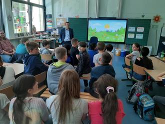 In diesem Jahr war der saarländische Landtagsabgeordnete und ehemalige Staatssekretär für Europa Roland Theis zu Gast und besuchte die beiden 4. Klassen.