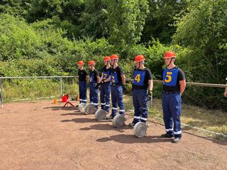 Vor Ort bewiesen die Teilnehmer ihr Können in 5 Disziplinen: Kugelstoßen, Schnelligkeitsübung, Löschangriff, Staffellauf und Fragenbeantwortung.