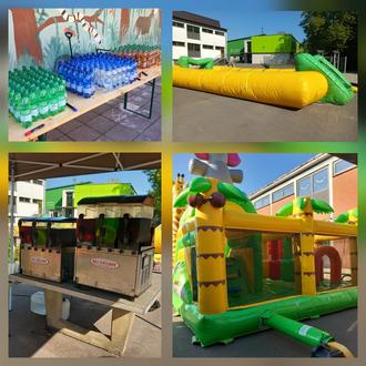Ab 8 Uhr bauten die fleißigen Helfer 2 Hüpfparcours und ein Human Table Soccer auf und richteten alles her für den großen Ansturm ab der 2. Schulstunde.