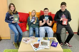 Die Schülerinnen und Schüler der Klasse 8b freuen sich über die neuen Bücher.