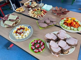 Am vorletzten Schultag war es endlich wieder soweit: jede Klasse der Grundschule Landsweiler-Reden bekam eine Kiste mit einem gesunden und leckeren Frühstück vom Schulförderverein. Jede Kiste war liebevoll gepackt mit frischem Brot von der Bäckerei Ziegler, verschiedenen Wurst- und Käsesorten, gekochten Eiern, Marmelade, Cherrytomaten, Salatgurke, Radieschen, Paprika, Trauben, Äpfeln und vielem mehr. Die Klassen konnten das Obst und Gemüse aus der Kiste selbst nach Lust und Laune verarbeiten und fleißig Brote belegen. Vom kleinen Büffet im Klassenzimmer bis zum individuellen Frühstück war alles dabei. Die Kinder freuten sich sehr über die vielen leckeren Sachen, bevor es dann endlich am nächsten Tag nach den Zeugnissen in die wohlverdienten Sommerferien ging.