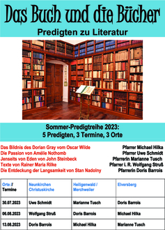 | 10.00 Uhr | Gottesdienst zur Predigtreihe Literatur mit Abendmahl (Pfarrer Hilka), Ev. Kirchsaal Merchweiler |