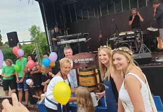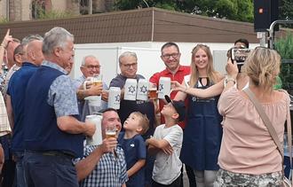 Nach nur einem gezielten Schlag konnte die Ortsvorsteherin gemeinsam mit Rosenkönigin Bianca I. und Rosenprinzessin Kristina I. Bier zapfen und an die Umstehenden verteilen.