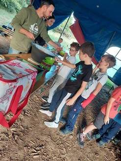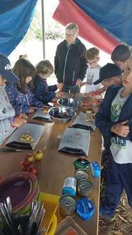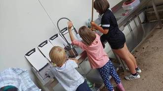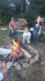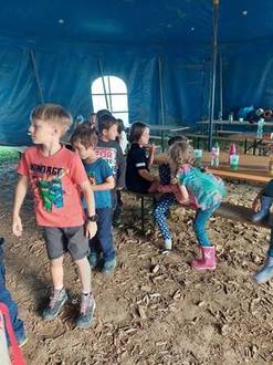 In den nächsten drei Tagen erwarten uns Arbeiten bei den Hühnern, Kühen und Schweinen. Wir treffen den neuen Nachwuchs bei den Kühen. Und auch kleine Ferkel sind zur Welt gekommen, die wir zum ersten Mal besuchen. Außerdem werden wir unser Essen selbst auf dem Feuer zubereiten wie zum Beispiel Rührei aus den Eiern, die wir selbst eingesammelt haben. Nach den Mahlzeiten haben alle mit angepackt und zusammen wurde das Geschirr gewaschen und alles aufgeräumt. Abends haben wir Stockbrot am Lagerfeuer gemacht. Das Zelt wurde bezogen und eingerichtet. Als endlich alle ihren Schlafplatz gefunden hatten, Luftmatratzen eingerichtet waren und es gemütlich war, konnten sich alle im Outdoor Bad bettfertig machen. Der erste erlebnisreiche Tag neigte sich nun dem Ende zu. Am nächsten Morgen wurden wir von schlechtem Wetter geweckt, was uns den ganzen Tag begleiten sollte. Aber wir ließen uns nicht unterkriegen und mit genügend Wechselkleidung, Lagerfeuer und heißem Kakao trotzen wir dem Wetter. Auch bei schlechtem Wetter galt es die Tiere zu versorgen und fleißig packten alle mit an. Heute haben wir die Molkerei besichtigt und die Kälbchen gefüttert. Außerdem mussten wir wieder zu den Hühnern, weil sich hier richtige Freundschaften entwickelt haben und die Kinder unbedingt ihr Lieblingshuhn knuddeln wollten. Auch kochen und spielen standen auf dem Programm. Mit dem Bauernhofhund haben wir noch einen Spaziergang zu den tragenden Kühen gemacht, um zu sehen ob es Nachwuchs gibt. Und endlich hörte es auf zu regnen. Nach dem die Kinder in der Outdoor Dusche vom Schmutz befreit waren, konnte die zweite Nacht starten. Mit einer Vorleserunde fanden die meisten schnell in den Schlaf. Nun brach bereits der letzte Tag an. Nun hieß es zusammenpacken und alle Fundsachen aufteilen. Zum letzten Mal besuchten wir noch einmal alle Tiere um uns zu verabschieden. Danach wurden die Kinder glücklich, müde und nass von ihren Eltern abgeholt….