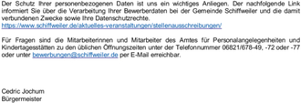 Der Schutz Ihrer personenbezogenen Daten ist uns ein wichtiges Anliegen. Der nachfolgende Link informiert Sie über die Verarbeitung Ihrer Bewerberdaten bei der Gemeinde Schiffweiler und die damit verbundenen Zwecke sowie Ihre Datenschutzrechte. https://www.schiffweiler.de/aktuelles-veranstaltungen/stellenausschreibungen/