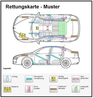 Die meisten Fahrzeughersteller bieten zwischenzeitlich Rettungskarten für ihre Modelle an. Dieses Blatt Papier, das in Farbe ausgedruckt sein sollte, liefert den Rettungskräften wichtige Informationen über das Fahrzeug. Die Rettungskarte wird im Fahrzeug an der Sonnenblende des Fahrersitzes hinterlegt. Damit die Rettungskräfte wissen, dass in ihrem Fahrzeug eine Rettungskarte liegt, muss eine Plakette im oberen Windschutzbereich der Fahrerseite von innen gut leserlich verklebt sein. Dadurch kann die Rettung - Ihre Rettung - beschleunigt und Sie vor weiteren Verletzungen geschützt werden. Es können auch Verletzungen der Rettungskräfte, welche wiederum Ihre Rettung verzögern würden, vermieden werden.