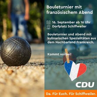 Der CDU Ortsverband Schiffweiler lädt erneut zum „Dorf spielt Boule“ auf dem Dorfplatz ein. Am 16.09.2023 könnt Ihr ab 16:00 Uhr in Zweierteams gegeneinander antreten und beim Boule Spielen Spaß haben und auch kleine Preise aufgrund der ausgespielten Startgelder gewinnen. Rund um und im Anschluss an das Turnier findet ein deutsch/französischer Abend statt. Neben Crêpes am Nachmittag gibt es Abends Flammkuchen und französichen Wein, aber ebenso Rostwürste und auch Bier. Eine Kombination also, im Sinne der deutsch/französichen Freundschaft. Wir freuen uns auf viele Gäste auch außerhalb des Bouelturnier.