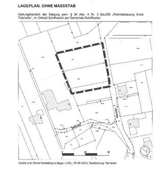 Der Gemeinderat der Gemeinde Schiffweiler hat in seiner Sitzung am 20.07.2023 gem. § 2 Abs. 1 BauGB und § 34 Abs. 4 BauGB beschlossen, das Verfahren zur Aufstellung der Ergänzungssatzung „Wohnbebauung Ende Talstraße“ einzuleiten (siehe Anlage Geltungsbereich). Der Entwurf der Ergänzungssatzung „Wohnbebauung Ende Talstraße“ besteht aus der Planzeichnung (Teil A) und dem Textteil (Teil B) sowie der zugehörigen Begründung. In seiner Sitzung am 20.07.2023 hat der Gemeinderat den Entwurf der Ergänzungssatzung „Wohnbebauung Ende Talstraße“, bestehend aus der Planzeichnung (Teil A) und dem Textteil (Teil B) sowie der Begründung, gebilligt und die öffentliche Auslegung beschlossen.