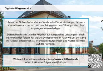 über unser Online-Portal www.schiffweiler.de > digitaler Bürgerservice. können Sie einzelne Serviceleistungen des Bürgeramts bequem von zu Hause aus sowie unabhängig von den Öffnungszeiten erledigen.