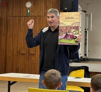 Der Autor war extra von der Nordsee nach Schiffweiler gekommen, um die Lesefreude der Kinder zu fördern und zu unterstützen. Josef Koller ist ein erfolgreicher Autor und Verleger, der nicht nur gut schreiben, sondern seine Geschichten auch so lebendig vortragen kann, dass die Schülerinnen und Schüler 45 Minuten gebannt lauschten. Mit viel Gestik, Mimik und einem gewissen schauspielerischen Talent stellte er seine verschiedenen Bücher vor. Alle Kinder der Klassen 1-4 waren begeistert, einen „echten Bücherschreiber“ kennengelernt zu haben.