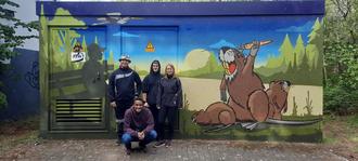 Seit letztem Wochenende erstrahlt nun die Trafostation am Rombachweiher auf der Altmühl/Graulheck in neuen Farben und Motiven. So finden sich Enten und Gänse, ein Fischreiher, Nutrias und auch ein paar Fledermäuse aus der nebenstehenden „Villa Fledermaus“ des NABU Gruppe Schiffweiler auf der Außenwand der Trafostation.