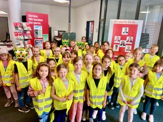 Die Schülerinnen und Schüler probierten ihre neuen Westen gleich begeistert an. Frau Nimsgern von der Drachenklasse und Frau Heib von der Otterklasse sind dankbar für die Unterstützung der Sparkasse, die mit dieser Spende einen wichtigen Beitrag zur Verkehrssicherheit der jüngsten Schulkinder leistet.