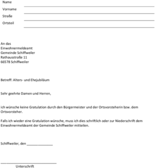 Sollte eine Gratulation durch den Bürgermeister sowie durch die zuständige Ortsvorsteherin bzw. den zuständigen Ortsvorsteher nicht erwünscht sein, so reichen Sie bitte das nachstehende Formular bis spätestens 21.11.2025 beim Einwohnermeldeamt der Gemeinde Schiffweiler, Rathausstraße 11, 66578 Schiffweiler, ein.
