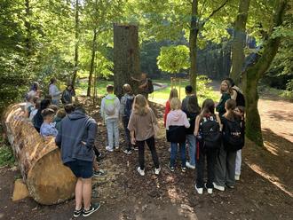 Als wir ankamen, gingen wir zunächst mit dem Waldpädagogen Johannes Schütte in den Wald. Es war schönes Wetter und wir wanderten an einem Bach entlang. Am Anfang erzählte Johannes uns vieles über die derzeitige Krise der Bäume und den Wald und zeigte uns wie man mit Kompass und Karte wandert. Am Hohen Felsen machten wir schließlich ein kleines Picknick.