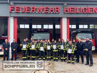 Die Lehrgangsbescheinigungen wurden von dem Wehrführer Christian Kleis zusammen mit dem Leiter des Schul- und Ausbildungsausschusses der Gemeinde Schiffweiler Tobias Closs, dem Leiter des Schul- und Ausbildungsausschusses des Landkreises Neunkirchen Michael Sticher und dem Ausbilder Christof Schneider überreicht.