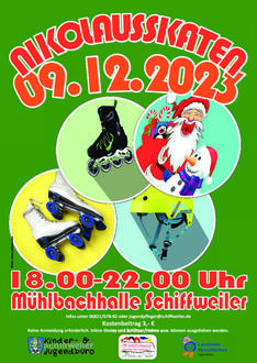 Zum traditionellen „Nikolaus-Skaten“ begrüßt das Kinder- & Jugendbüro der Gemeinde Schiffweiler und der Förderverein Kinder „Die Rasselbande“ Schiffweiler am Samstag, 09.12.2023 alle Kinder, Jugendliche und Erwachsene in der Mühlbachhalle Schiffweiler. Von 18.00 - 22.00 Uhr wird ein Übungsparcours mit kleinen Rampen aufgebaut. Außerdem stehen Wippen bereit, die von den Fortgeschrittenen genutzt werden konnten. Zwei Anleiter von Caro’s Inline Academy helfen den AnfängerInnen bei den ersten Schritten auf den Inline Skates. Die Scooter-Area wird ebenfalls beim letzten Nightskaten wieder angeboten. Das Tragen von Helm und Schützern ist vorgeschrieben. Wer diese nicht besitzt, kann alles kostenfrei bei Caro's Inline Academy entleihen. Die Teilnahme erfolgt natürlich auf eigene Gefahr!