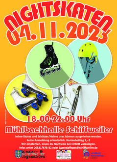 Zum vorletzten Mal für 2023 begrüßt das Kinder- und Jugendbüro der Gemeinde Schiffweiler am Samstag, 04.11.2023 alle Kinder, Jugendliche und Erwachsene in der Mühlbachhalle Schiffweiler zum allseits bekannten Nightskaten.