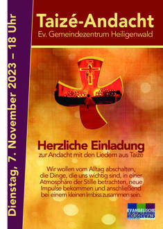 | 18.00 Uhr | Taizé-Andacht, Ev. Gemeindezentrum Heiligenwald |