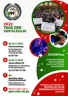 Am 26.11.2022 von 10 Uhr -13 Uhr bietet die Schule unter dem Motto „ADVENTure - vorweihnachtliche AbenteuerREISE durch die SCHULE der ZUKUNFT“ eine Reise in Stationen durch die verschiedenen Schulgebäude: spannende Mitmach- und Entdeckungsmöglichkeiten unter anderem in den Bereichen Naturwissenschaften, Robotik, Musik, Sport un in den Werkstätten erwarten die Gäste genauso wie Informationen und Präsentationen rund um das außergewöhnliche Schulprofil.