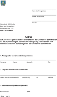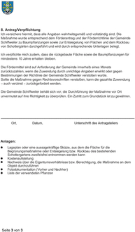 (3) Der Antrag ist auf dem dafür vorgesehenen Formular ausgefüllt beim Umweltamt der Gemeinde Schiffweiler einzureichen. Geforderte Unterlagen sind vollständig einzureichen.