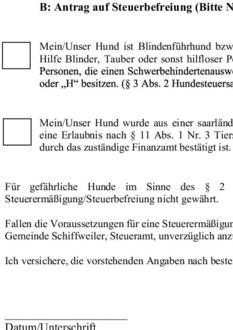 Steuerbefreiungen bzw. Steuerermäßigungen sind in den §§ 4 und 5 der Hundesteuersatzung der Gemeinde Schiffweiler aufgeführt.