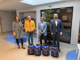 Bürgermeister Markus Fuchs bedankt sich für die blauen Rutschautos, die im Rahmen eines gemeinsamen Termins mit den Sales Managern der DSV Road GmbH Homburg Frau Asmae Challi und Herr Patrick Zimmer, Initiator der Spendenaktion an die Kinder übergeben wurden. Auch die KiTa-Leiterinnen Nadine Böcker und Sina Schwindling bedanken sich im Namen aller Kinder für die tollen LKW-Rutschautos.