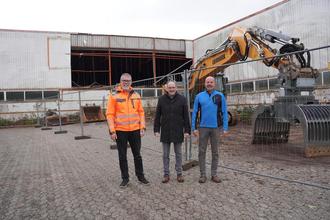 Die ersten Abrissarbeiten haben bereits begonnen. Bürgermeister Markus Fuchs, Ortsvorsteher Holger Maroldt und Bauamtsleiter Thorsten Siebraße informierten sich über den Beginn der Abrissarbeiten. Zunächst finden im Inneren des ehemaligen Möbelhauses die ersten Rückbaumaßnahmen statt.
