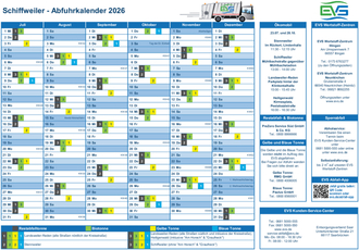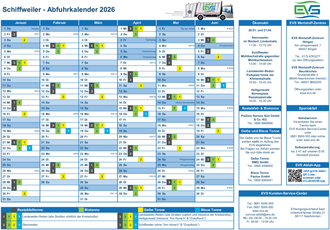 Die Abfuhrtermine für die Restabfall- und Biotonne bleiben 2026 unverändert. Die aktuellen Termine können auf der Website des EVS unter www.evs.de/abfuhrtermine eingesehen und heruntergeladen werden. Der Online-Kalender bietet Wochen-, Monats- und Jahresübersichten sowie eine praktische E-Mail-Erinnerungsfunktion.