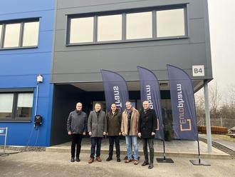Erfolgreich am Nußkopf: Bürgermeister Cedric Jochum, Wirtschaftsförderer Landkreis Neunkirchen, Geschäftsführer Ahmad Mansour, Landrat Sören und Betriebsleiter Thomas Engler (v.r.n.l.) vor dem Verwaltungsgebäude des Pharma-Campus