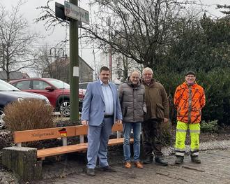 Bürgermeister Markus Fuchs und Ortsvorsteher Mathias Mauermann haben gemeinsam mit dem Bauhof die Bänke inspiziert und der Öffentlichkeit übergeben. Der Petinger Platz trägt seinen Namen aufgrund einer bereits seit Jahrzehnten bestehenden Freundschaft zwischen Heiligenwald und der Partnergemeinde Commune de Pétange (Luxemburg). Zu Ehren dieser Partnerschaft sind auf den Bänken die jeweiligen Ortsnamen „Heiligenwald“ und „Pétange“ eingraviert.