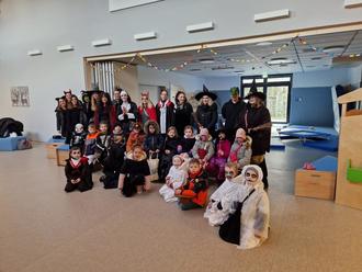 Im Vorfeld hatten die Kinder mit tatkräftiger Unterstützung des Haustechnikers Stefan und ihren Erzieherinnen Saskia und Ayline einen kleinen Faschingswagen gebaut. Es wurde gesägt, geschliffen, gemalt, geklebt und gebastelt und so entstand ein kleines gruseliges Gespensterschloss.