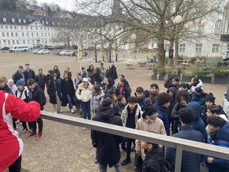 Am Tag vor dem Treffen waren wir alle gespannt und aufgeregt, wie unsere Austauschpartner sein würden und wie unser Treffen verlaufen würde. Alle Schülerinnen und Schüler der 8. und 9. Klasse des Französischkurses von Frau Prost und Frau Peifer fuhren zunächst mit dem Zug von Schiffweiler nach Saarbrücken und wanderten zum Schlossplatz. Dort trafen wir zum ersten Mal auf unsere französischen Austauschpartner vom Collège Robert Schumann aus Behren-les-Forbach. Seit Beginn des Schuljahres hatten wir regelmäßig Briefe ausgetauscht und Fotos sowie kleine Videos von uns und unserer Schule hin- und hergeschickt. Entsprechend groß war die Aufregung, als wir morgens am Saarbrücker Schloss ankamen. Nachdem wir unsere Partnerinnen und Partner begrüßt hatten, waren wir alle sehr zufrieden. Zunächst waren wir alle ein wenig schüchtern und trauten uns noch nicht viel zu sprechen. Im Laufe des Tages lernten wir uns jedoch immer besser kennen, und es fiel uns auch leichter, uns auf Französisch zu verständigen. Zuerst besuchten wir das Historische Museum in Saarbrücken, wo wir eine Führung auf Deutsch und Französisch durch die Ausstellung und die Kasematten erhielten.