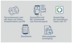 Die elektronische Wohnsitzanmeldung kann mit der Online-Ausweisfunktion des Personalausweises in Verbindung mit der BundID durchgeführt werden. Am bequemsten funktioniert dies direkt mit dem Smartphone. Nach der Identifizierung werden Ihre Meldedaten aus dem Melderegister abgerufen. Anschließend ergänzen Sie Ihre Daten, laden, falls Sie nicht in einem Eigenheim wohnen, die Wohnungsgeberbestätigung hoch und senden den Antrag ab.