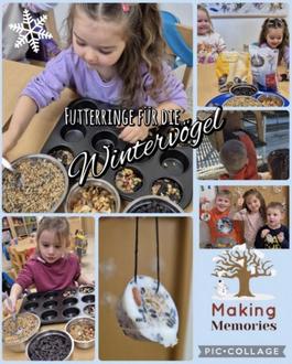 Die Kinder lernten unter anderem verschiedene Wintervögel kennen und erfuhren, dass viele Tiere im Winter weniger Nahrung finden. Daher ist es besonders wichtig, ihnen Futter anzubieten. Mit großem Interesse betrachteten die Kinder Bilder der Vögel und tauschten sich darüber aus, welche sie vielleicht schon im Garten oder auf dem Gelände der Kita entdeckt haben. Ein besonderer Höhepunkt war das gemeinsame Herstellen von Futterringen. Mit Körnern,Kernen Nüssen, Rosienen, Fett und etwas Geduld entstanden viele kleine Futterringe, die anschließend an Bäumen und Sträuchern zuhause aufgehängt werden können. So können die Kinder die Vögel beobachten und gleichzeitig etwas Gutes für die Natur tun. Die Kinder hatten viel Freude bei dieser Aktion und lernten dabei spielerisch, wie wichtig es ist, auf Tiere und Natur zu achten – besonders in der kalten Winterzeit.