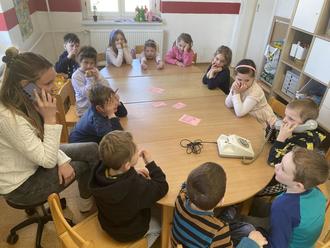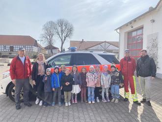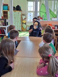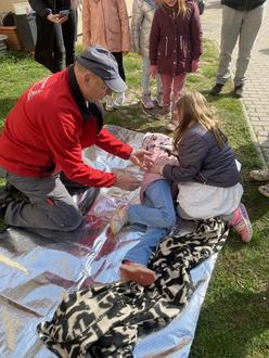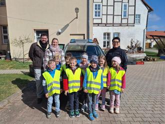 Aber nicht nur bei den Schmetterlingen war es aufregend im März, auch bei unseren Vorschülern war einiges los. Als Plötzlich die Polizei auf das Gelände fuhr, schaute auch unser Stadtarbeiter Heiko nicht schlecht. Aber keine Angst, er hat nichts angestellt, sondern Frau Montag zusammen mit Handpuppe Henriette war für die Verkehrserziehung im Haus. Schon seit Jahrzehnten übernimmt sie diesen Job und macht dies immer noch mit ganz viel Herz. Unsere Vorschulkinder haben gemeinsam mit ihrer Erzieherin Lena und Berufspraktikant Leon die letzten Wochen sich auch fleißig auf den Termin vorbereiten, sind den Schulweg abgelaufen, haben Verkehrszeichen gelernt und können ihre Adresse wie aufs der Pistole. Dieser Termin war für uns unheimlich wichtig, denn wir wollen unsere Vorschüler mit einem guten Gefühl in die Schule geben und wollen, dass sie auf ihren Schulweg sicher sind. Letzte Woche kam dann die nächste Überraschung, der Notarztwaren fuhr vor den Kindergarten. Denn auch die erste Hilfe war Lena wichtig und gemeinsam mit dem DRK durften die Kinder stabile Seitenlage lernen, sich den Notarztwagen mal genau anschauen und sich verbinden. Die beiden Kollegen Ralf und Antonio vom DRK haben alle Informationen unseren Kindern so toll rübergebracht, dass wir auch richtig gemerkt haben, mit wie viel Engagement sie dabei sind. Es war nicht nur für unsere Kinder eine Wonne zuzuhören, sondern auch für uns. Auch hier haben Lena und Leon schon die letzten Wochen sich tolle Sachen einfallen lassen, um mit den Kindern die W Fragen zu lernen. Ein altes Telefon mit Drehschreibe kam zum Einsatz um den Notruf zu üben, Kuscheltiere durften mitgebracht und verarztet werden und die Erste Hilfe Decken können immer noch wunderbar zum Höhlen bauen genutzt werden.