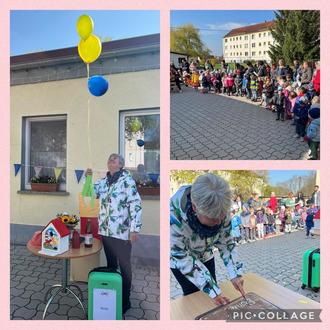 Zu diesem Anlass versammelten sich am Vormittag alle Kinder und MitarbeiterInnen der Kita „Sonnenkäfer“, der Bürgermeister Herr Abicht, MitarbeiterInnen der Landgemeinde Greußen, KollegInnen anderer Kindertagesstätten und Netzwerkstellen auf dem Vorplatz. Mit dem Begrüßungslied:“ Machet auf das Tor, machet auf das Tor, es kommt ein gold’ner Wagen …“ wurde Birgit in die Mitte ihrer Gästerunde begleitet und nach Kindergartenmanier verabschiedet.