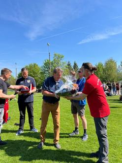 Zwischen den Turnieren gab es Raum für Ehrungen. Alexander Klement, Vorsitzender des Jugendausschuss beim Kreisfußballausschuss Nordthüringen (NTKFA), überreichte dem Vereinsvorstand einen Wertscheck über 300,00 €. Der Verein hatte Ende letzten Jahres die Auszeichnung „Aktivster Verein mit Nachwuchsbetrieb 2023/2024“ erhalten und nun wurde der feierliche Rahmen des Kinderfestes nachträglich genutzt, um ein paar lobende Worte über die breite Nachwuchsarbeit an die Anwesenden zu richten. Der Verein bedankt sich dafür auch noch einmal an dieser Stelle beim NTKFA und bei Alexander Klement.