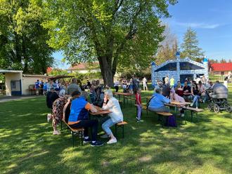 Auf die Kinder warteten zahlreiche Angebote zum Spielen, Herumtollen und einfach Spaß haben. Hüpfburgen waren aufgebaut, beim Kistenstapeln im Kletterturm konnten die Kinder ihr Geschick testen und Spielgeräte und Kinderschminken rundeten das Angebot ab. Vom „Angelverein Topfstedt e.V.“ war Daniel Nadler den ganzen Tag mit seinem Angelstand und Familie vor Ort.
