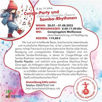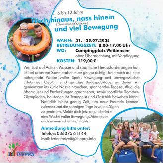 Auch in diesem Sommer wird es in Weißensee wieder lebendig und bunt: Der THEPRA Landesverband Thüringen e.V. lädt Kinder zu zwei spannenden Ferienfreizeiten ein. Vom 21. bis 25. Juli 2025 erwartet 6- bis 12-Jährige unter dem Motto „Hoch hinaus, nass hinein und viel Bewegung“ eine Woche voller Action, Wasserspaß, Entdeckungen und sportlicher Herausforderungen. Vom 28. Juli bis 1. August 2025 dreht sich dann alles um heiße Rhythmen bei der „Conga-Party und Samba-Rhythmen“ - ein Angebot für 8 - bis 14-Jährige, mit mitreißenden Workshops der Escola Popular, viel Musik, Tanz und einer tollen Abschlussshow.