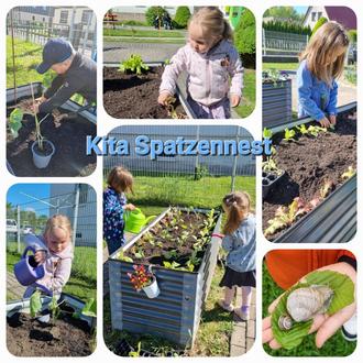 Zum Glück wachsen unsere Kinder hier im ländlichen Bereich auf, sodass die Kids schon über eine Vielzahl an Wissen rund ums Obst und Gemüse haben. Natürlich erleben und lernen bei diesem Projekt auch unsere Kleinsten der Kita schon richtig viel. Anfang Mai hieß es dann - Ärmel hoch und ab an die Hochbeete. Zum Bepflanzen standen uns 3 Beete für leckere Gemüsesorten zur Verfügung. Das Beet mit den leckeren Erdbeeren vom Vorjahr trägt in diesem Jahr schon richtig gute Früchte. Nach der Vorbereitung mit frischer Pflanzerde wurden eifrig Löcher gebuddelt damit die Salat-, Gurken-, Kohlrabi- Zucchini- und Tomatenpflanzen einen Platz bekommen konnten. Auch frische Kräuter fanden ein Plätzchen. Mittlerweile sind unsere Kinder fleißig mit den Gießkannen unterwegs und kümmern sich um die jungen Pflänzchen. Schließlich möchten sie auch bald schon die Ernteerfolge sehen.