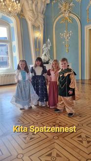 Am Mittwoch, dem 21. Mai, machten "unsere Großen" der Kita Spatzennest einen tollen Ausflug. Mit dem Schulbus ging es zu einem ganz besonderen Besuch ins Schlossmuseum nach Sondershausen. Nach einem kleineren Fußmarsch und ganz schön anstrengenden Stufen erreichten wir den Schlosshof. "Das Schloss ist ganz schön riesig", stellten die Kinder fest und ehe wir uns versehen konnten, waren wir schon mitten in der königlichen Märchenführung. Dabei durfte sich jedes Mädchen in ein schönes Kleid und unser – leider an diesem Tag – einziger Junge in das Gewand eines Prinzen hüllen. Herr Grüner, der die Märchenführung mit Museumspädagogik leitete, brachte uns von Zimmer zu Zimmer einer ganz anderen Welt näher. Die Kids kamen manchmal aus dem Staunen gar nicht mehr heraus. Und da gab es ja auch noch die versteckten Märchen zu erraten... Die Zeit verging wie im Flug und Schwupps waren wir auch schon beim Highlight der goldenen Kutsche angelangt. Unserem Dank gilt Herrn Grüner für die beeindruckende Führung und unserem sehr geschätzten Förderverein der Kita Spatzennest, die uns diesen Ausflug mit Besichtigung und sogar das Mittagessen spendiert haben. Herzlichen Dank hierfür!