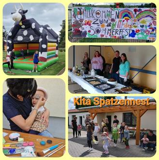 Am 6.Juni luden die Kinder, Erzieherinnen und der Förderverein der Kita zum großen Sommerfest ein. Zahlreiche Familienmitglieder unserer Kinder folgten der Einladung und begaben sich zum Fest auf den Sportplatz wo bereits ein großes geschmücktes Festzelt und eine Hüpfburg vorbereitet waren. Die Kinder im Alter von 1 bis 6 Jahren führten ein kleines "tierisch" gutes Programm auf. Es wurden tolle Gedichte vom Sommer vorgetragen, Mitmach-Lieder getanzt und gesungen. Im Anschluss lud das reichlich bestückte Kuchenbuffet zum Verweilen ein. Bei Kaffee und Kuchen fand man sich gemütlich im Festzelt ein und ließ den sonnigen Tag bei netten Gesprächen ausklingen. Hier möchten wir uns bei den fleißigen Kuchenbäckern für die leckeren Sachen ganz herzlich bedanken! Auch eine Erfrischung in Form von leckeren Eis gab es vom Eismobil des CAN Asia Imbiss Greußen. Das hatten sich die Kinder echt verdient. Bei Kinderschminken, Glitzertattoos, Spiel und Spaß verging der schöne Nachmittag wie im Flug. Das Resümee des Tages verhieß ein richtig gelungenes Sommerfest für Groß und Klein. Wir freuen uns bereits auf das nächste Mal.