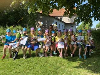 Der Tag hielt noch viele Überraschungen bereit - nicht nur für unsere Vorschulkinder, sondern auch für uns Erwachsene. Rosalie sorgte zunächst mit einer erfrischenden Abkühlung für gute Laune, bevor es auf spannende Schnitzeljagd zum Zuckertütenbaum ging. Dort wartete ein besonderer Moment: Unsere Vorschulkinder führten ein liebevoll vorbereitetes Programm als Dankeschön an ihre Eltern auf.