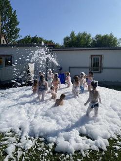 Anschließend war es endlich so weit - die feierliche Übergabe der Zuckertüten! Gemeinsam mit den Eltern wurde dieser besondere Anlass ausgiebig gefeiert. Eine von den Eltern organisierte Hüpfburg und die Schaumkanone sorgten für jede Menge Spaß, und auch die Wasserpistolen boten bei sommerlicher Hitze willkommene Erfrischung für Groß und Klein.