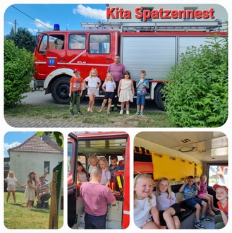 Zeitgleich übten sich die Kleineren der Kita schon mal richtige Feuerwehrleute zu sein und konnten mit Kommando "Wasser marsch" und einem kleinen D-Strahlrohr einen Brand bekämpfen. Zuletzt durften die Großen natürlich noch eine kleine Runde mit dem Feuerwehrauto mitfahren, das hatten sie sich ja auch verdient.