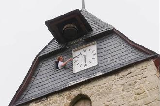 Die Kirchturmuhr in der Holzengler St. Trinitatis Kirche.