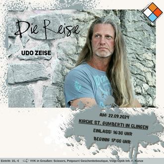 Dieses Jahr ist er wieder unterwegs. Diesmal live mit Band und neuen Songs im Gepäck! Die Zuhörer erwartet ein abwechslungsreiches und abendfüllendes Programm der besonderen Art. Mit aussagekräftigen deutschen Texten und groovenden Songs nimmt Udo Zeise die Gäste mit auf eine Reise durch sein Leben, erzählt von Begegnungen, Lebensweisen, Gefühlen und seiner Sicht auf die Dinge.